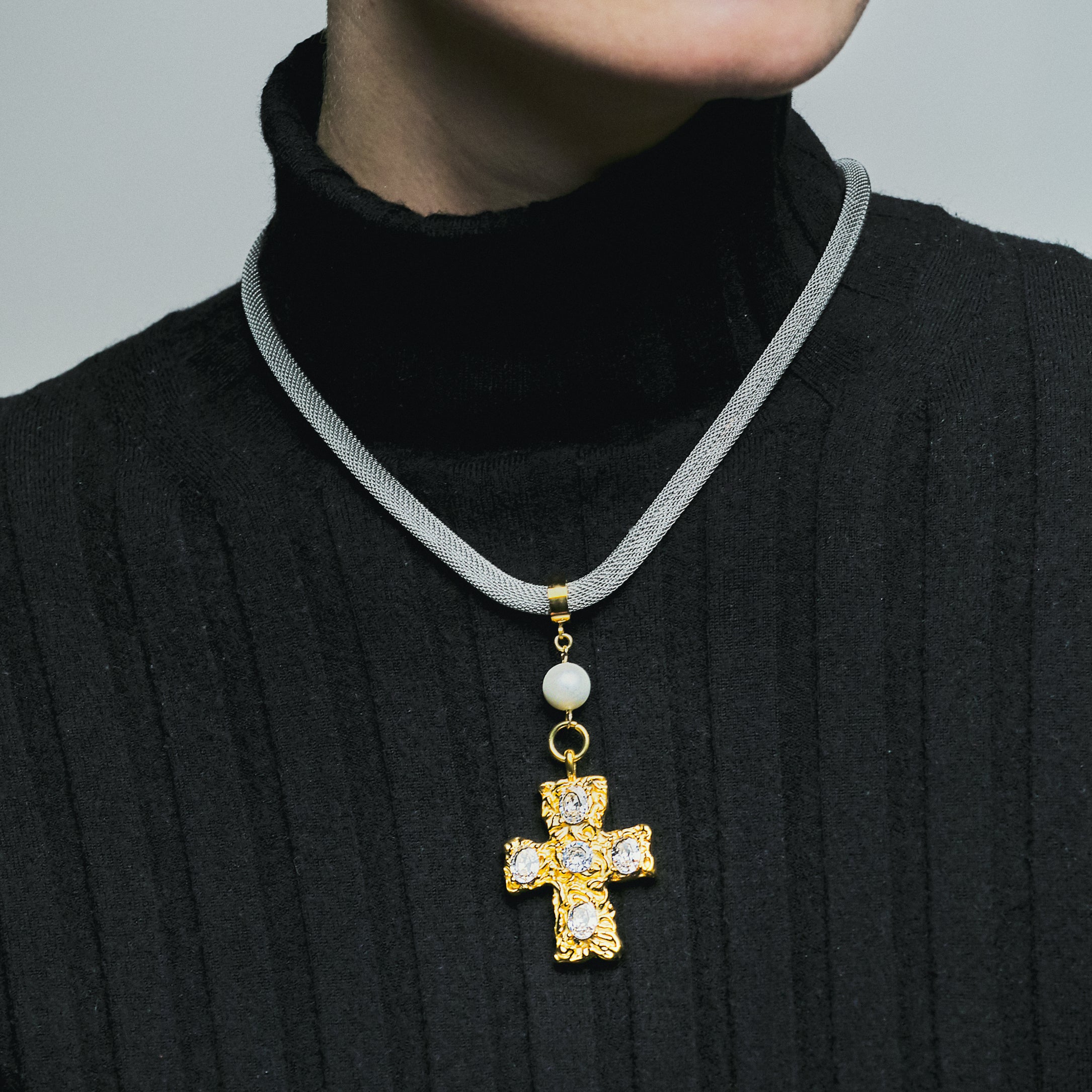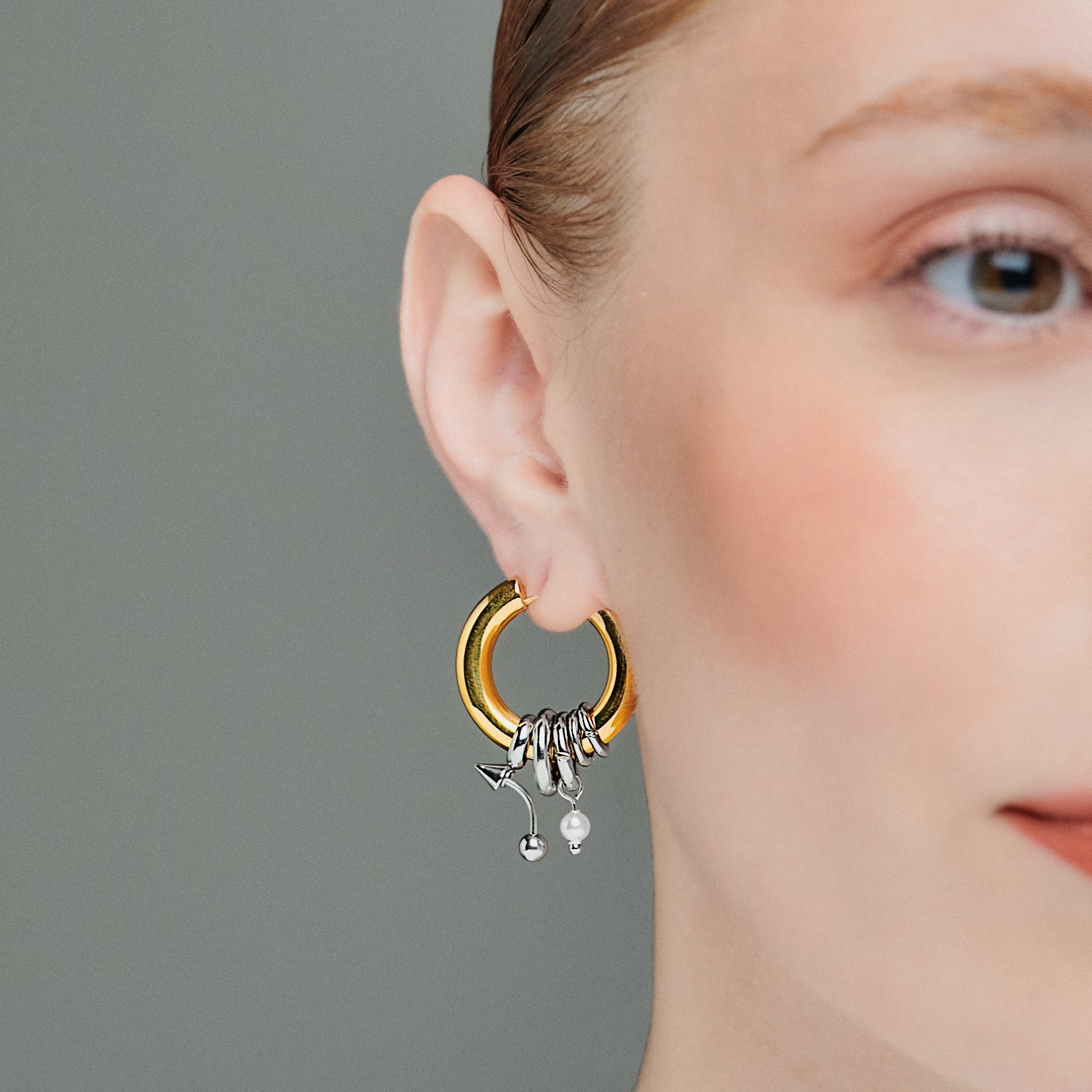 —acero, baño de oro, circonitas, perlas y gemas naturales—.