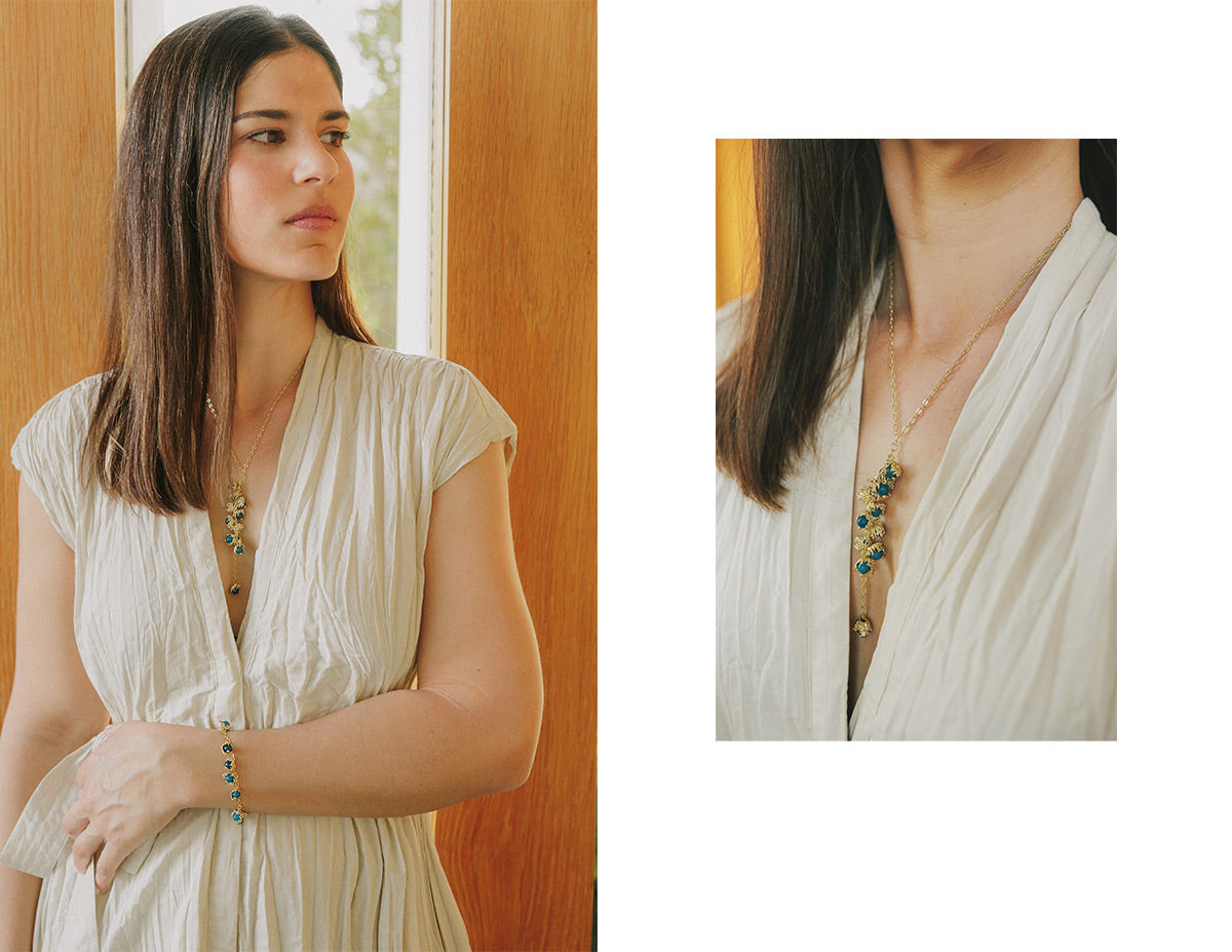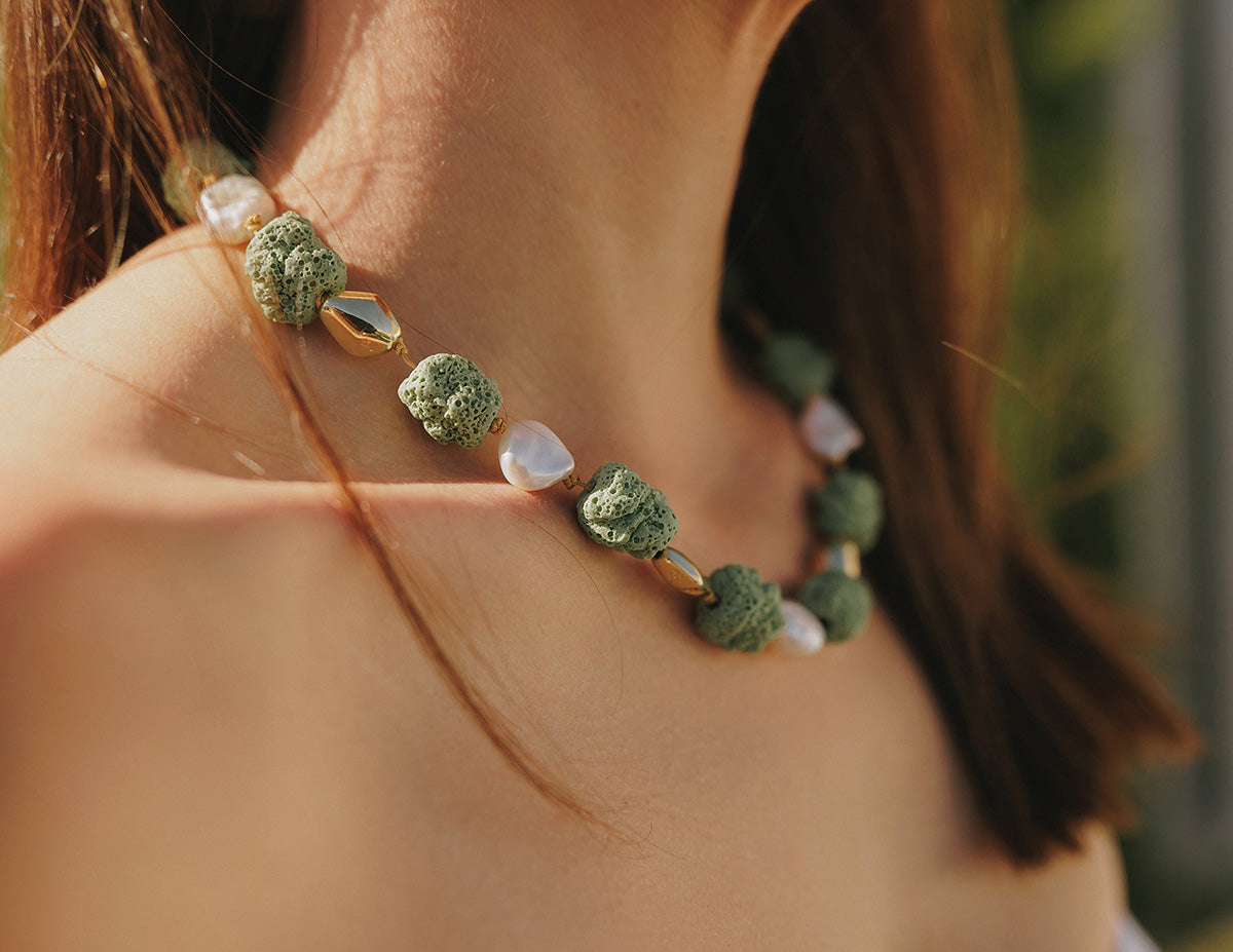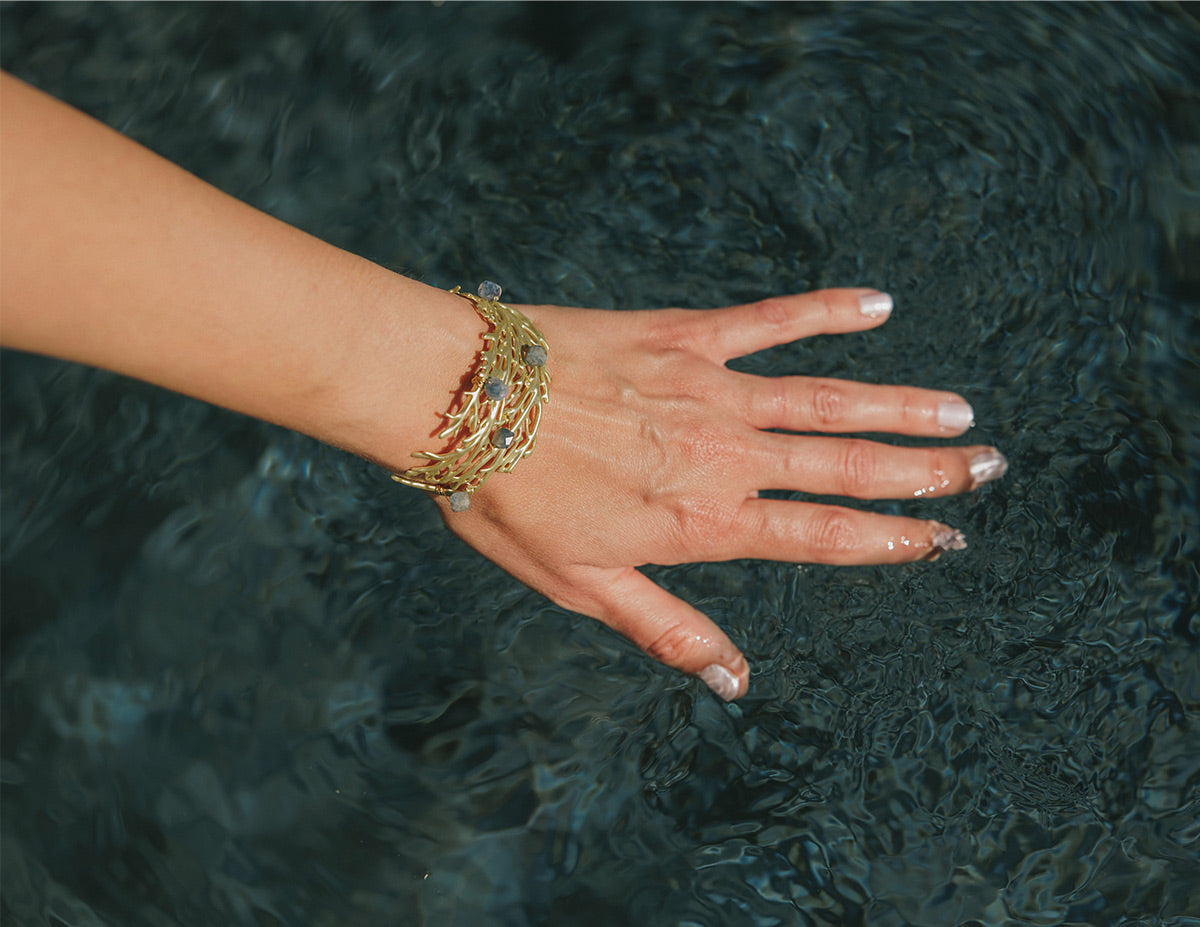 Cada elemento ha sido cuidadosamente seleccionado para capturar la esencia del océano: Aguamarinas, ópalo azul, hematites y cianita representan el brillo de luz que atraviesa sus profundas aguas. Lava de color para imitar las texturas únicas de los corales. Ágatas, rodonitas, perlas de agua dulce, componentes en forma de coral y bambú oceánico completan esta colección que transmite la complejidad y fragilidad del universo marino.