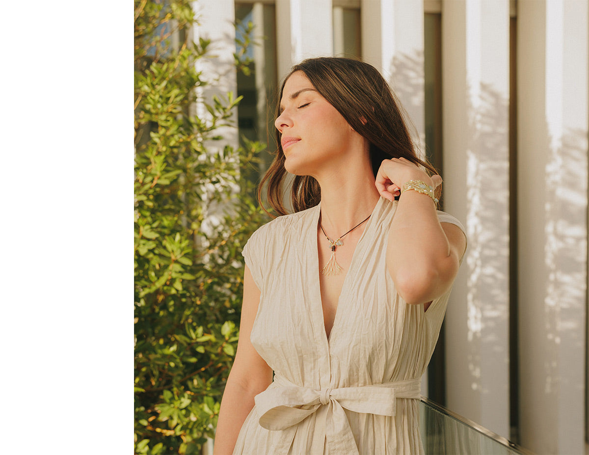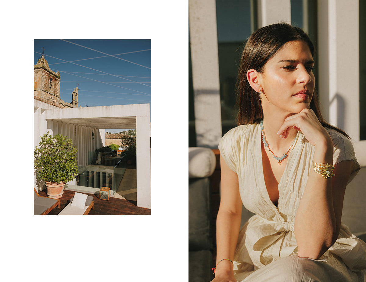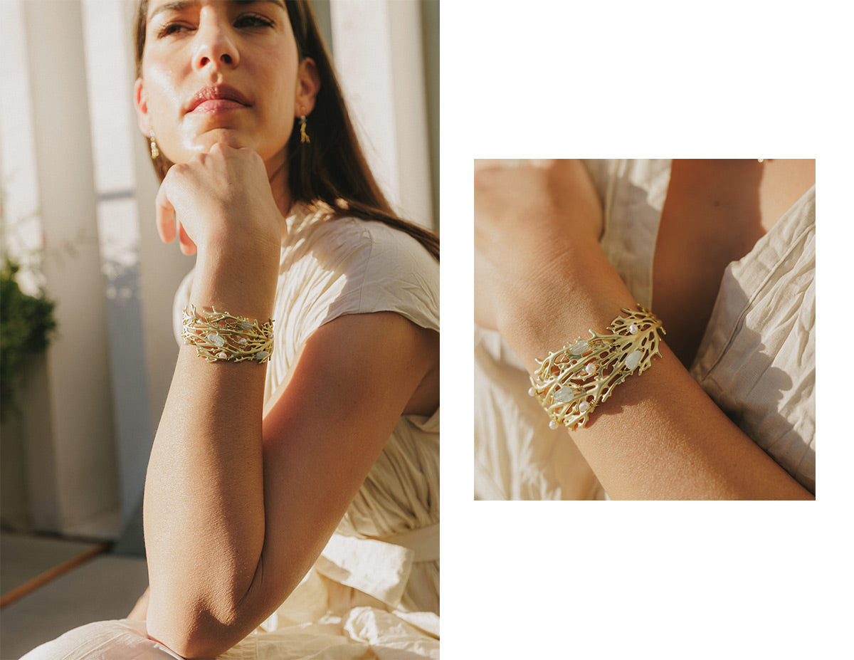 Cada elemento ha sido cuidadosamente seleccionado para capturar la esencia del océano: Aguamarinas, ópalo azul, hematites y cianita representan el brillo de luz que atraviesa sus profundas aguas. Lava de color para imitar las texturas únicas de los corales. Ágatas, rodonitas, perlas de agua dulce, componentes en forma de coral y bambú oceánico completan esta colección que transmite la complejidad y fragilidad del universo marino.