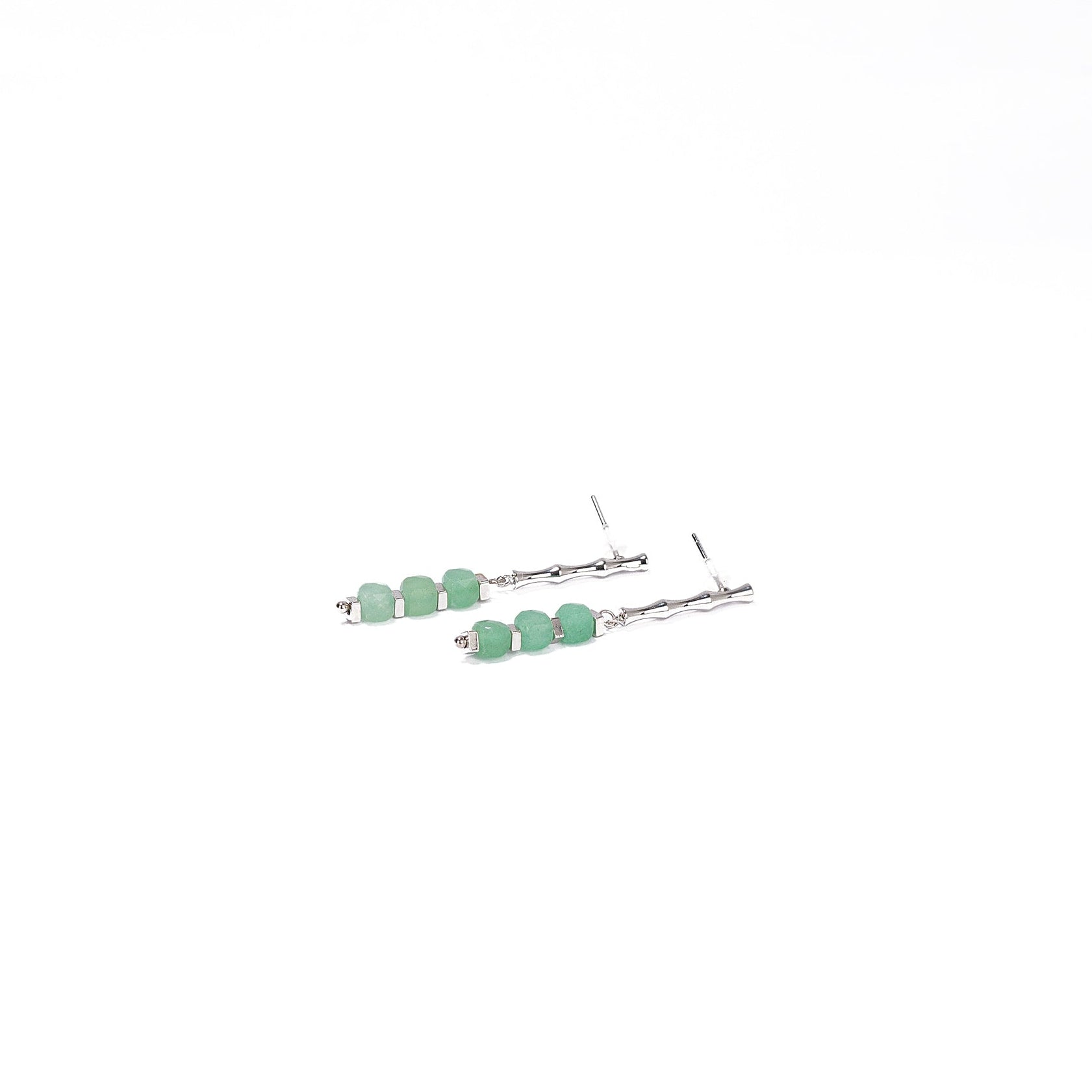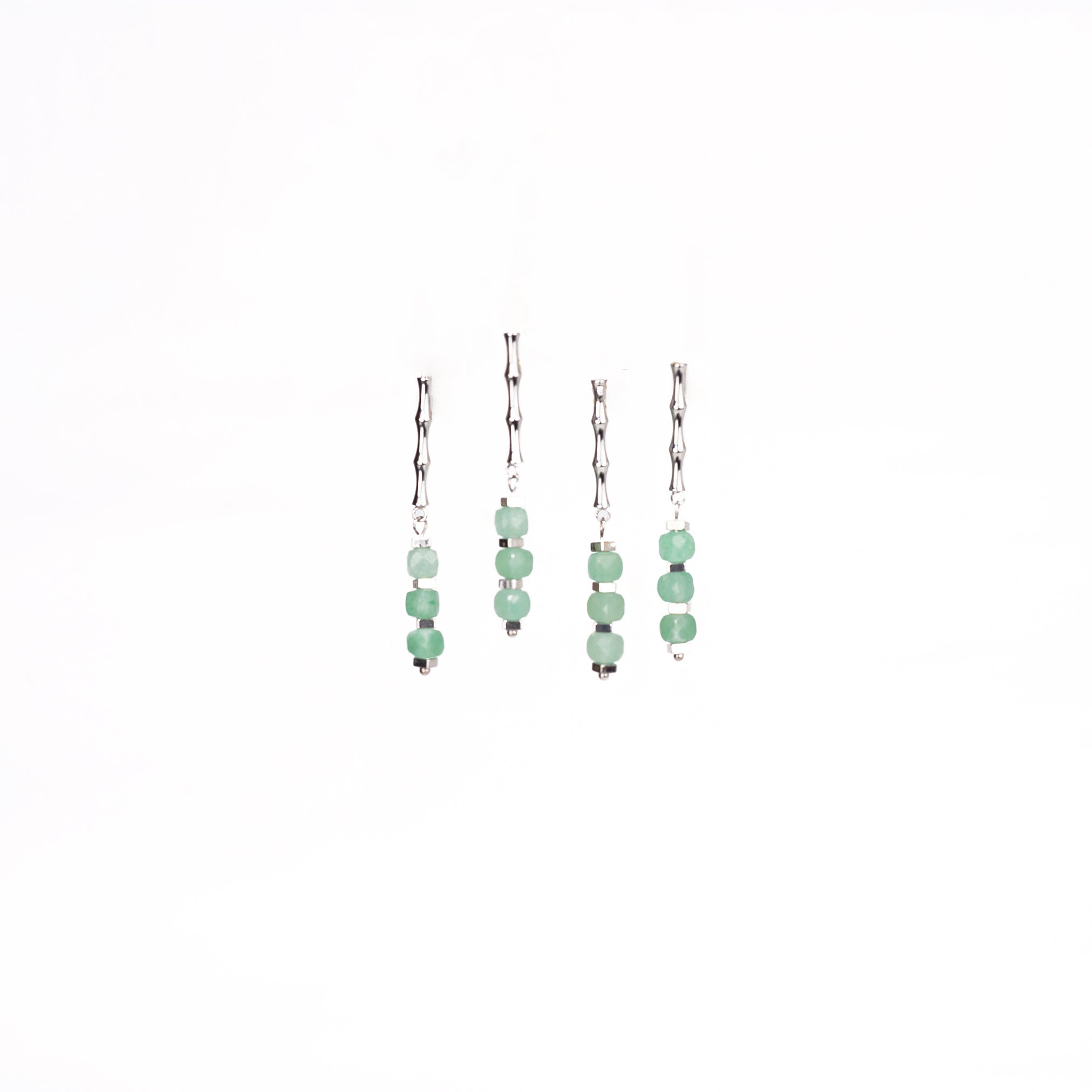 Pendientes Echo II con perno rígido inspirado en el bambú, rematados por tres cubos de aventurina pulida. El juego entre líneas estructuradas y el acabado mineral aporta una silueta arquitectónica con sutil delicadeza. Una pieza que equilibra carácter y sofisticación contemporánea.