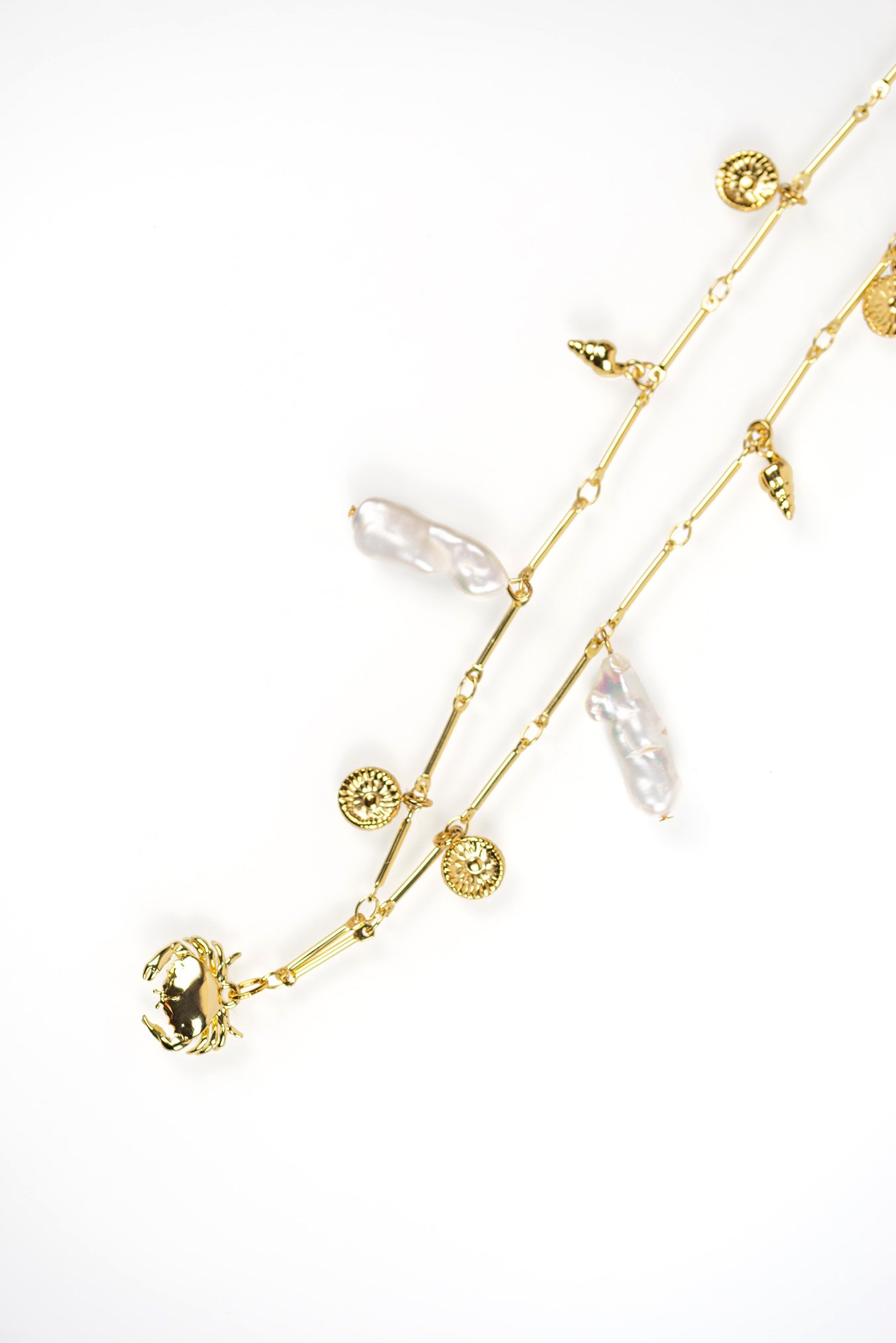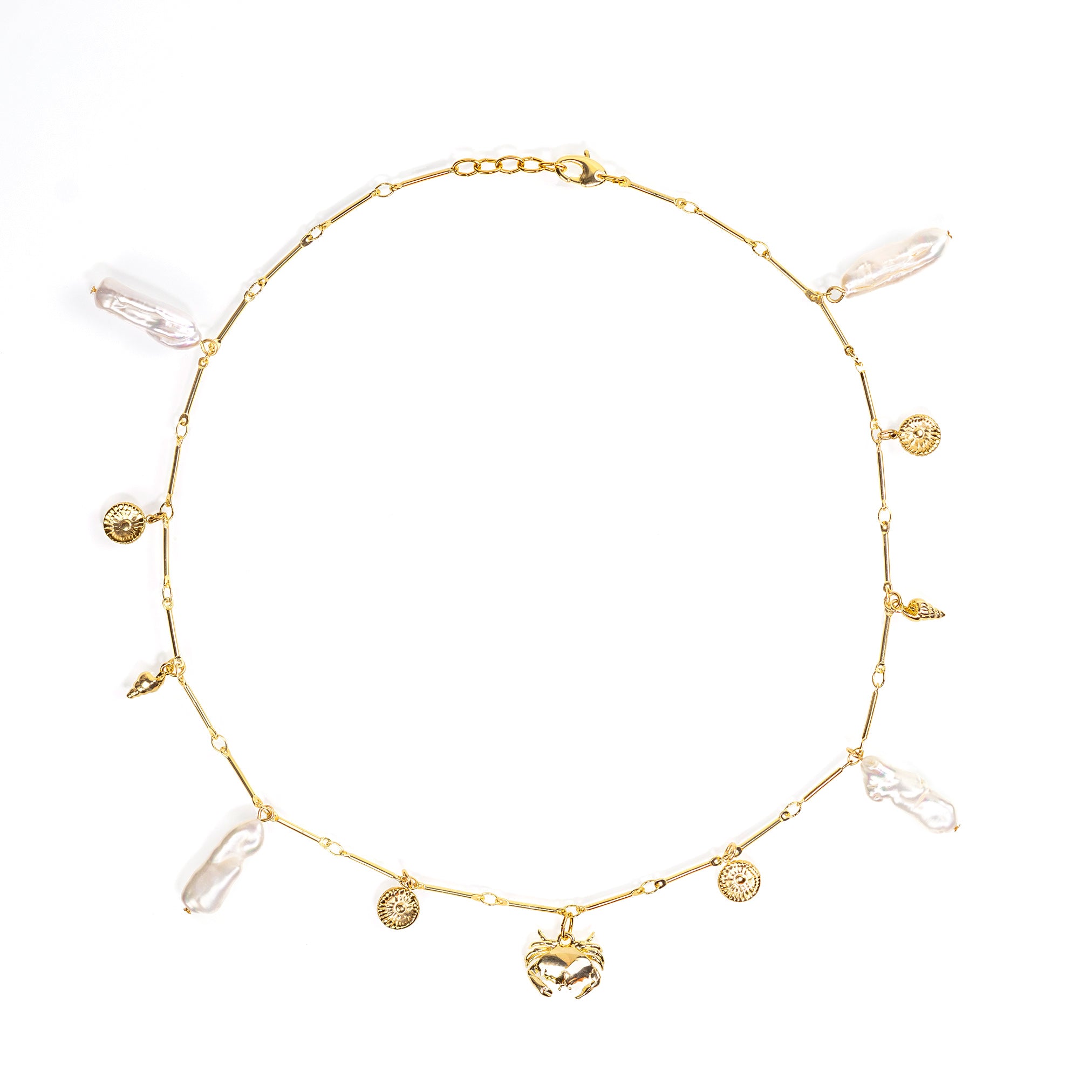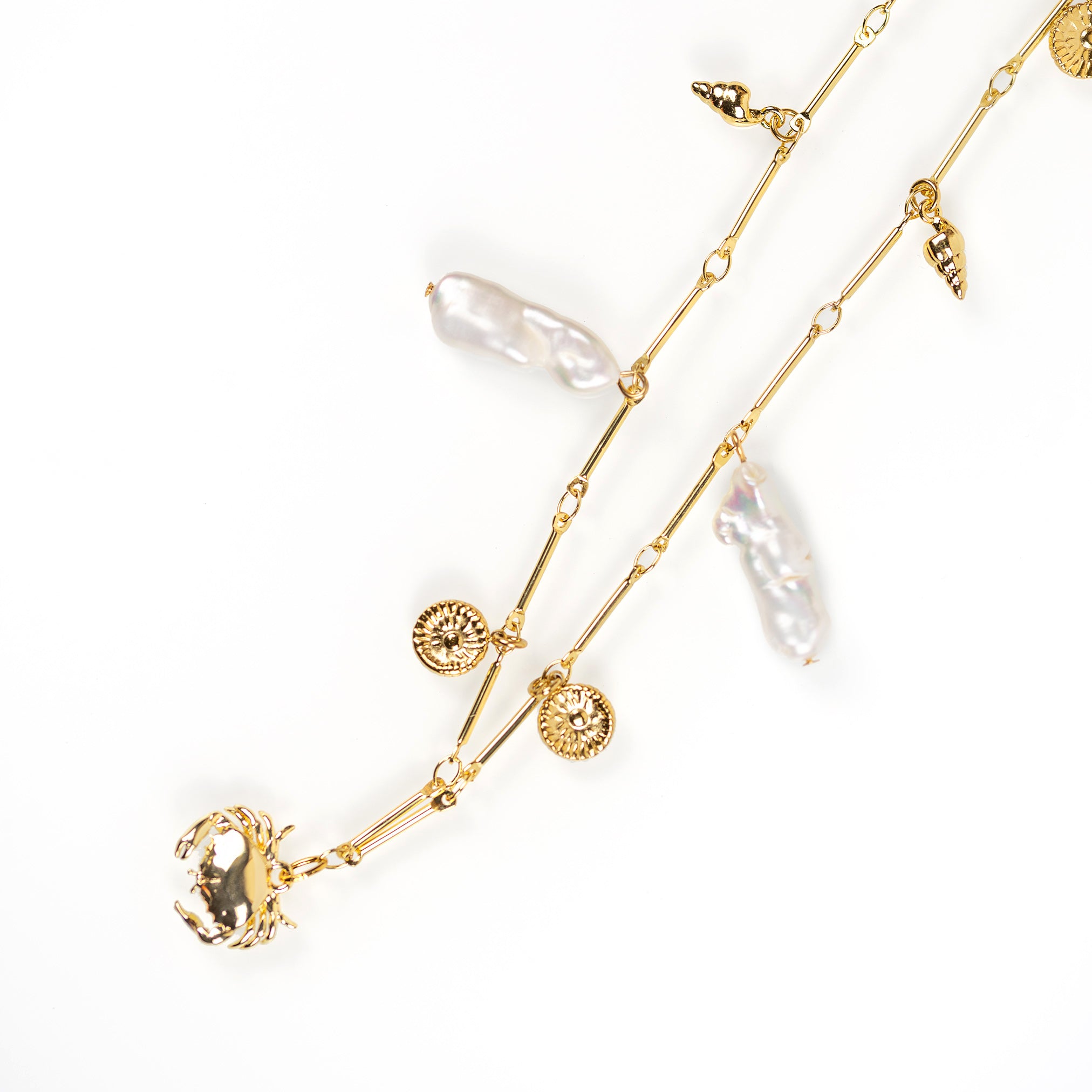 El Collar Fenicia es un homenaje a la riqueza marina y cultural de la costa gaditana. Una composición única de perlas keshi cultivadas, conchas doradas y pequeños charms que cuelgan de una cadena lineal de eslabones, evocando los antiguos tesoros del mar. Una joya escultórica y elegante con carácter editorial
