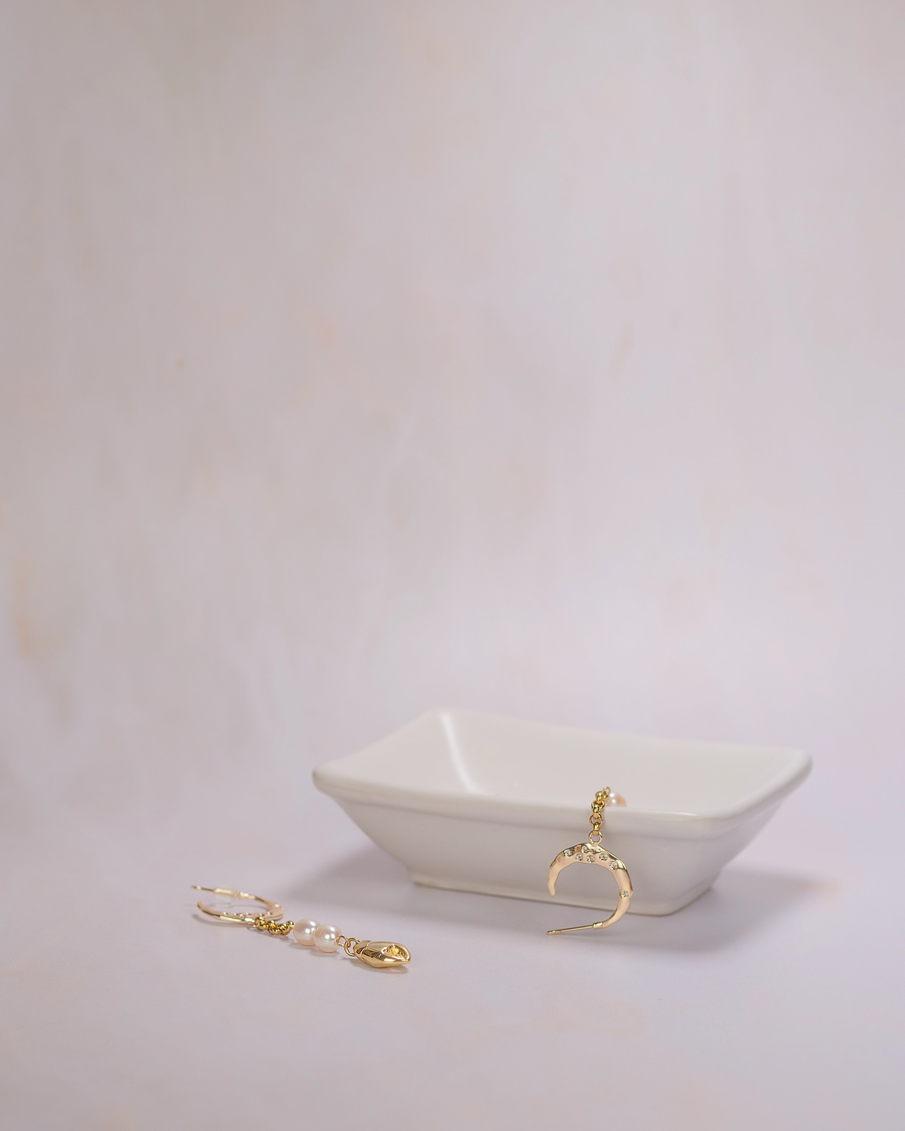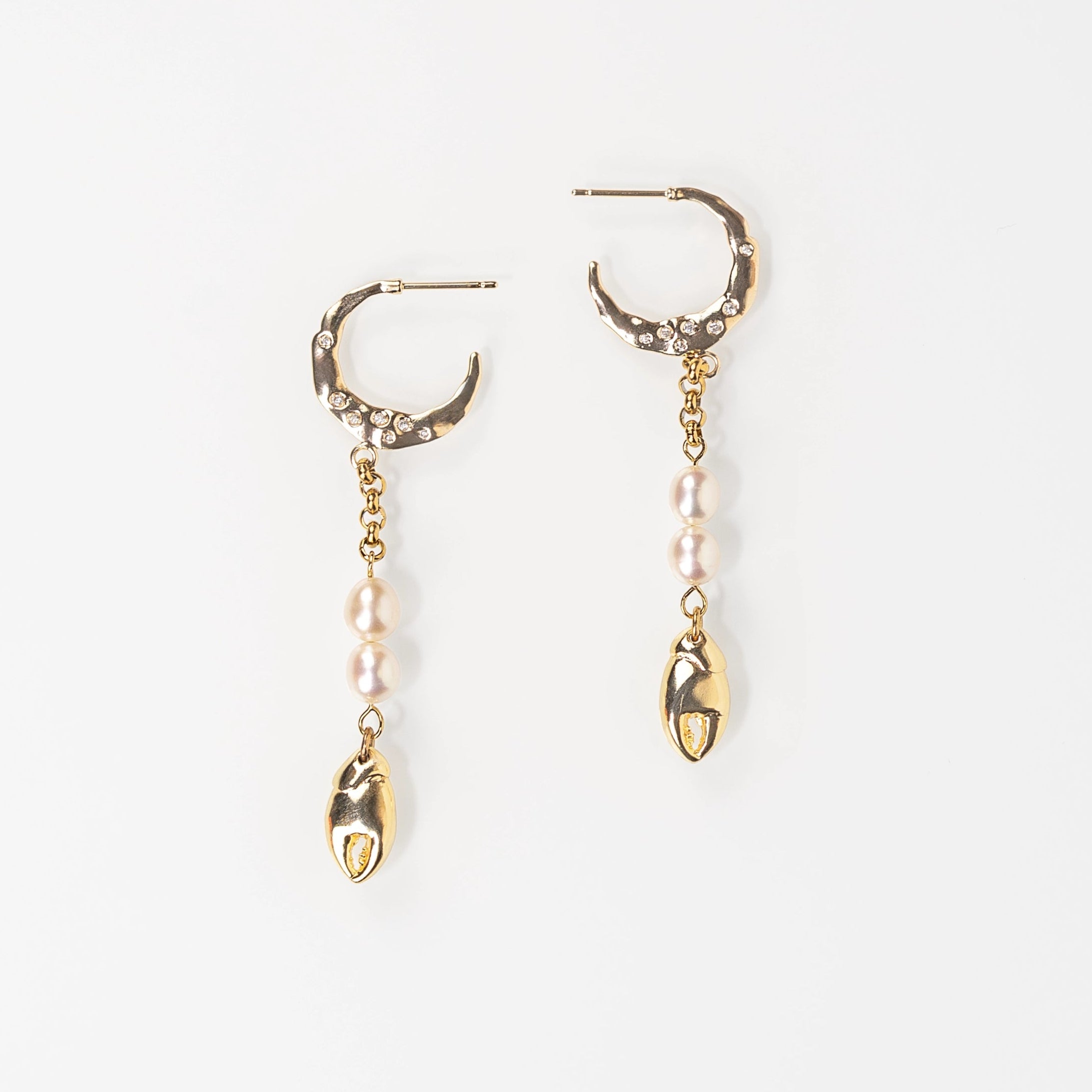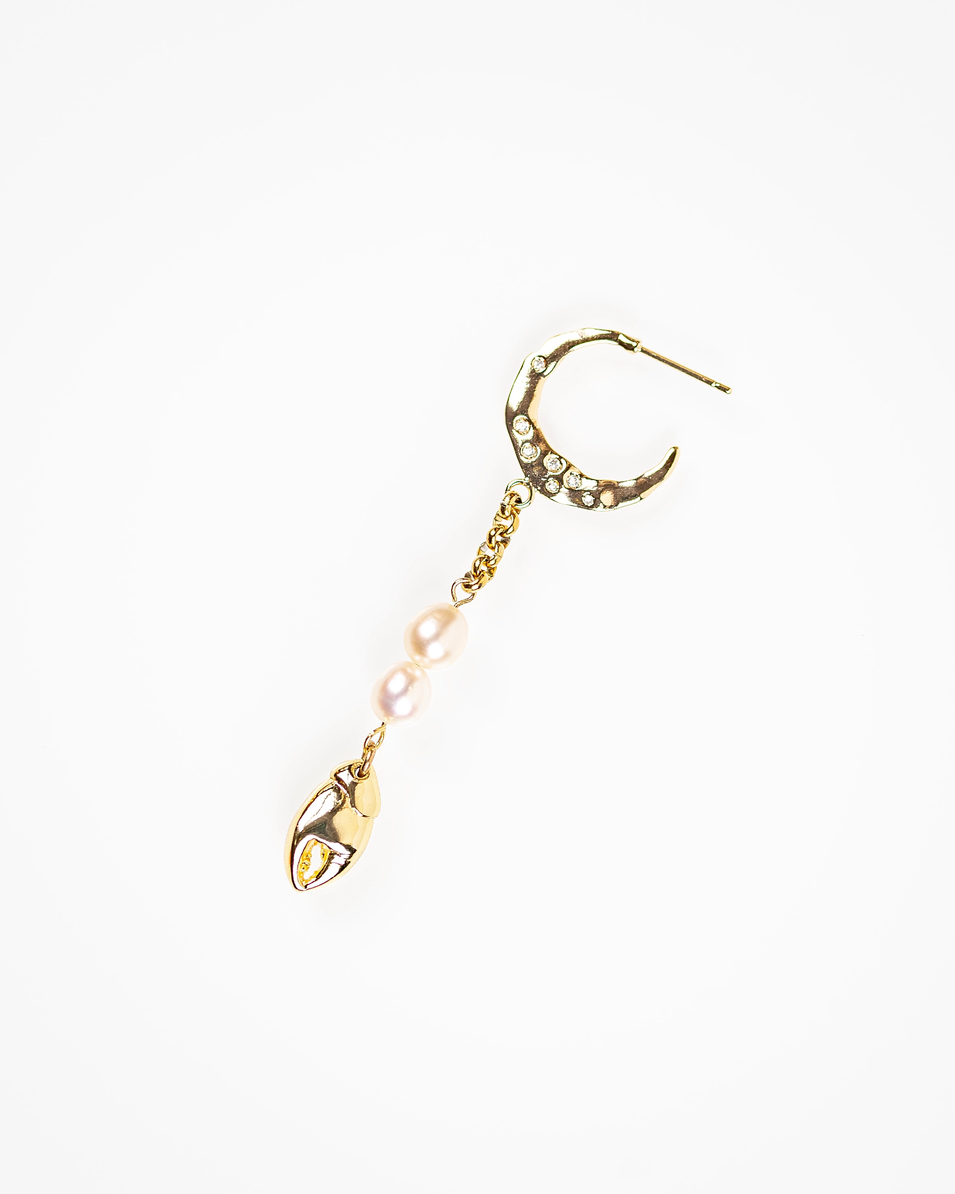 Los Pendientes Gades evocan la fuerza del mar y el magnetismo de la luz. Un diseño delicado y sofisticado, donde el brillo del medio aro con circonitas se combina con perlas naturales y un charm en forma de pinza de cangrejo. Movimiento, contraste y carácter para un look contemporáneo.