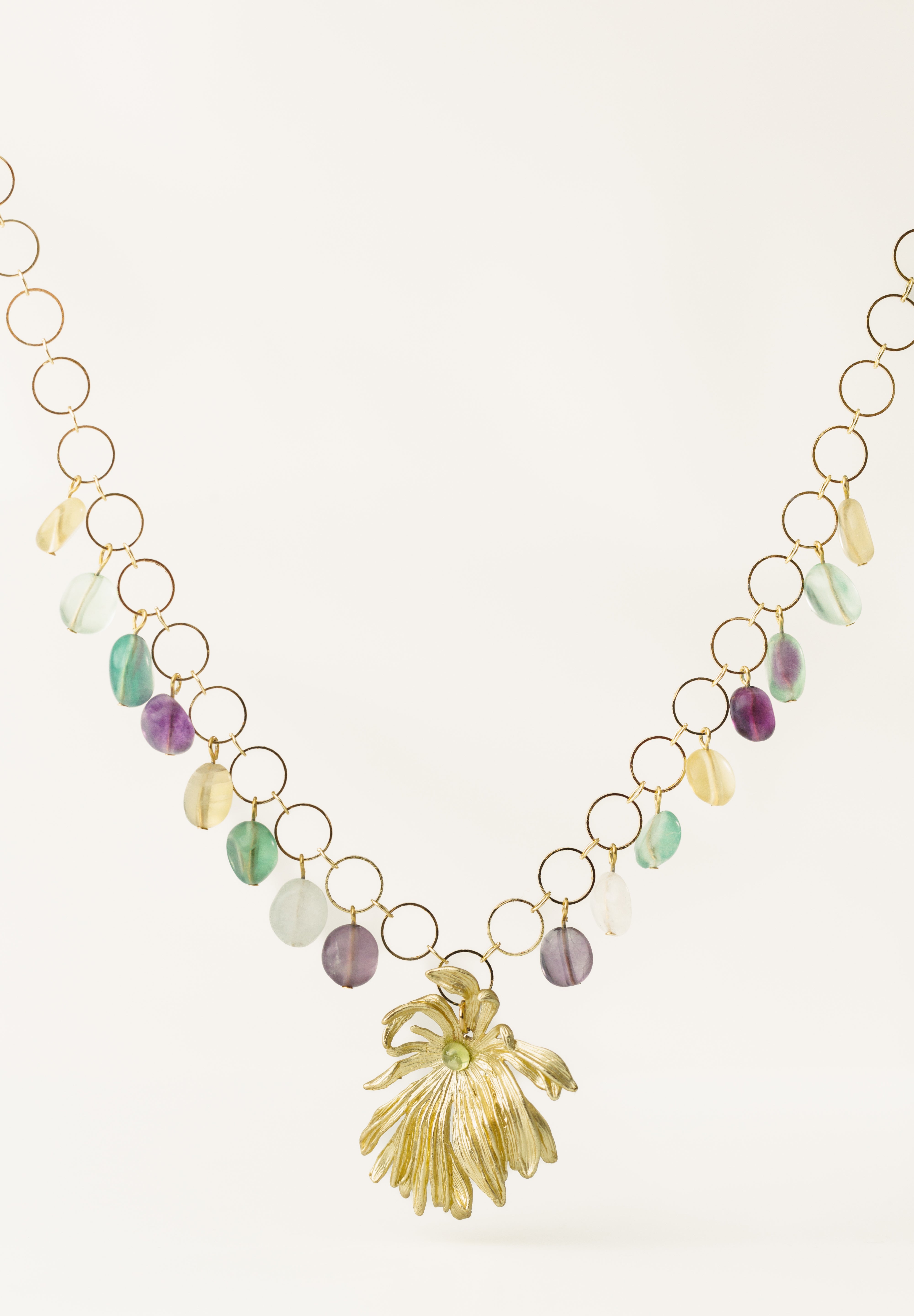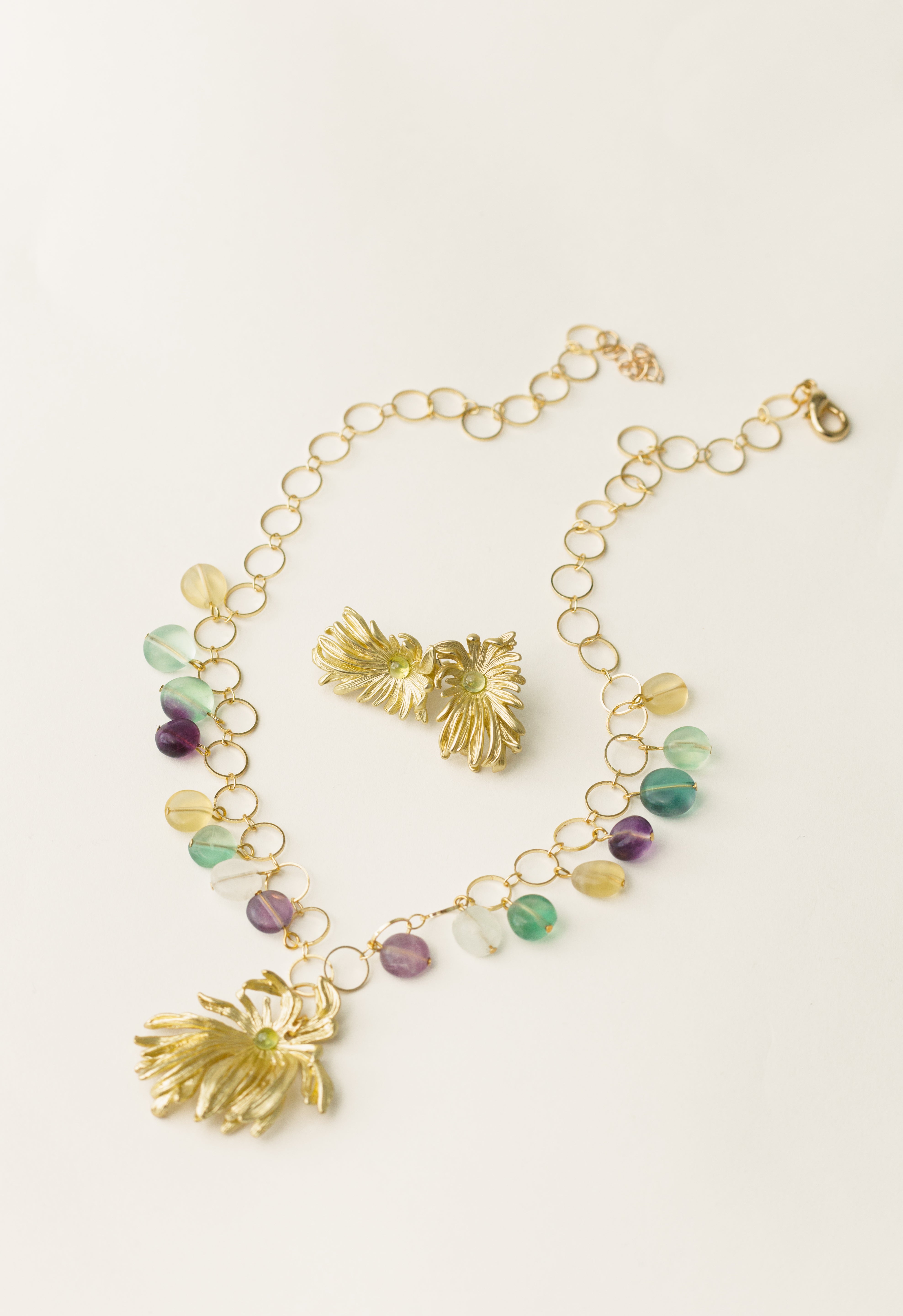 Su diseño combina una fina cadena de latón bañada en oro, elegida por su brillo cálido y sofisticación, con piedras naturales seleccionadas: fluoritas en tonos verdes y malvas, y un peridoto central que aporta frescura y armonía al conjunto.