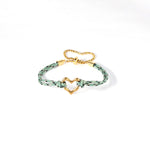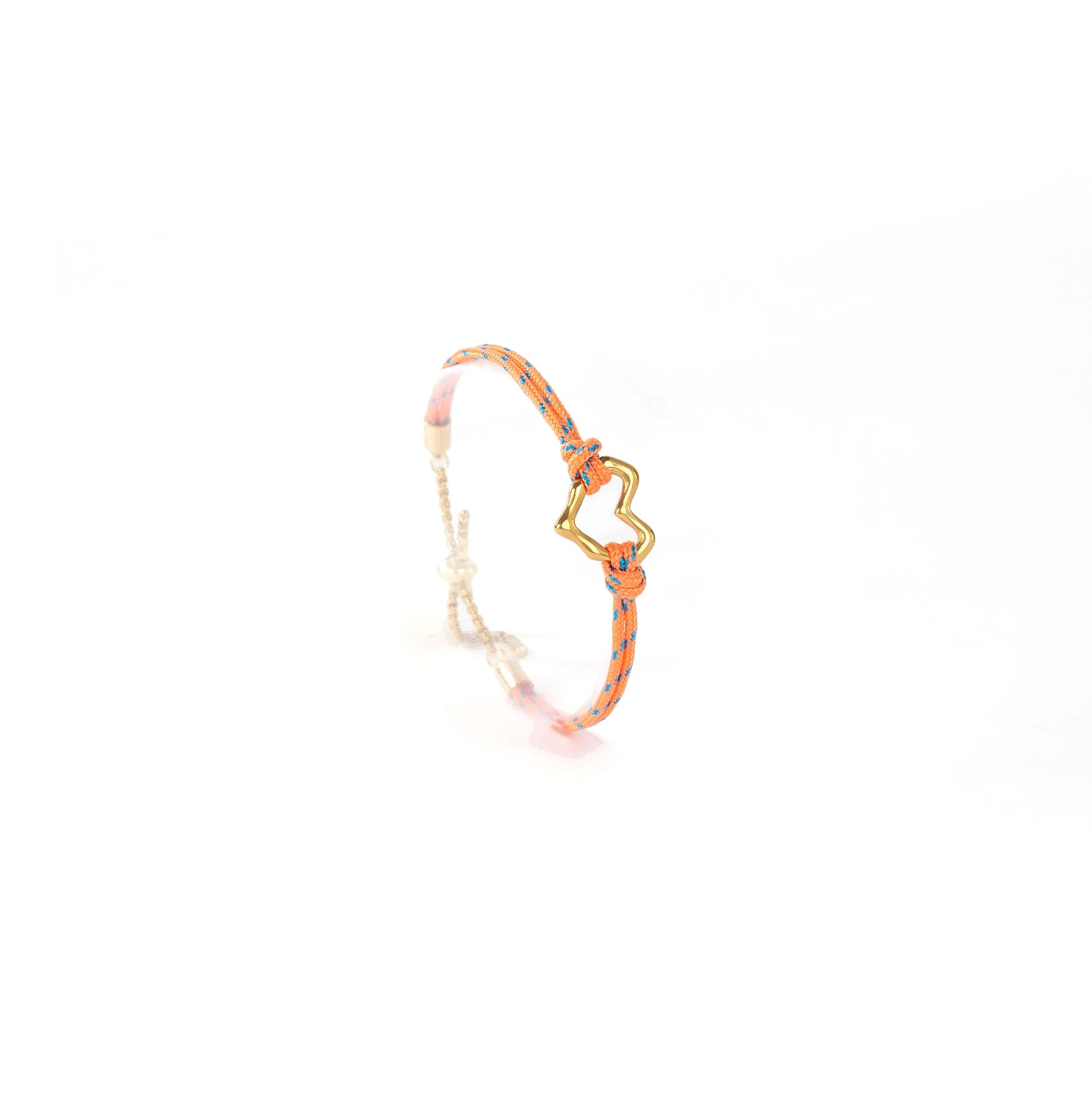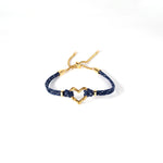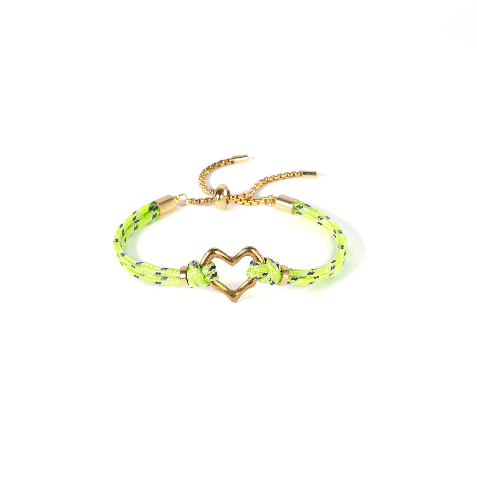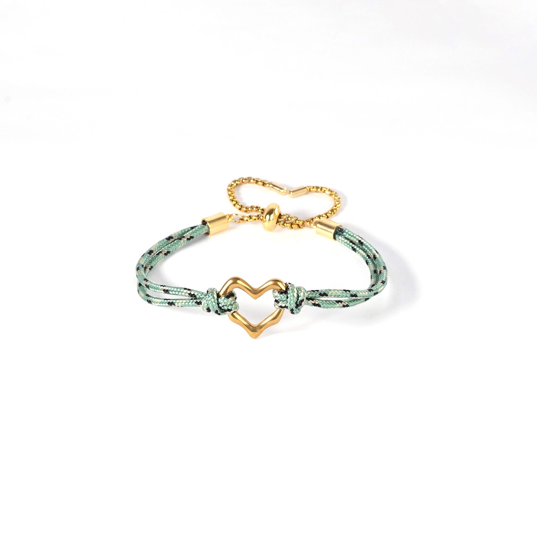 Diseñada para adaptarse con naturalidad, esta pulsera combina un cordón trenzado estilo marino con un colgante de corazón de acero hipoalergénico bañado en oro de 18k. El cierre ajustable en acero permite llevarla con precisión y comodidad.