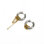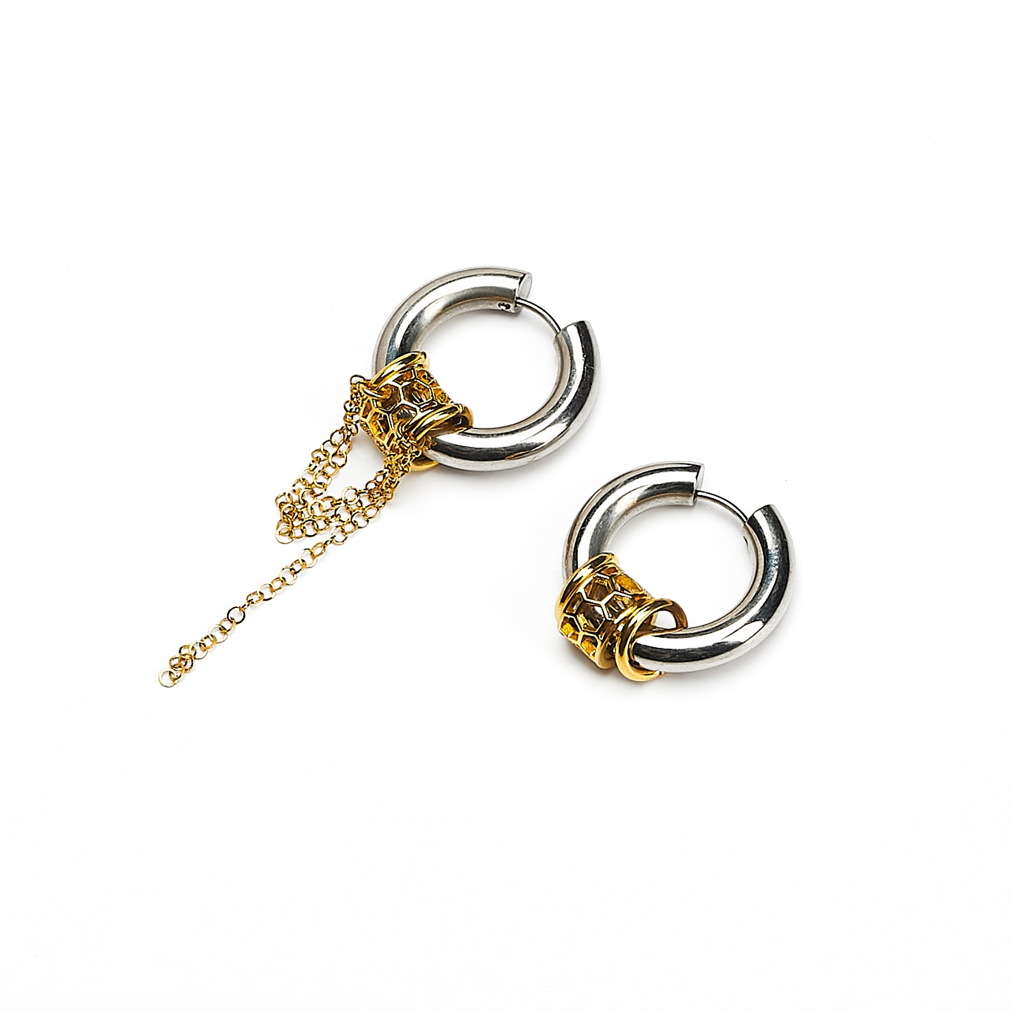 Aros pulidos de acero inoxidable con detalles dorados en latón bañado en oro de 18k y circonitas engastadas. Una fina cadena rolo, también en acero chapado, aporta movimiento y luz.