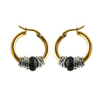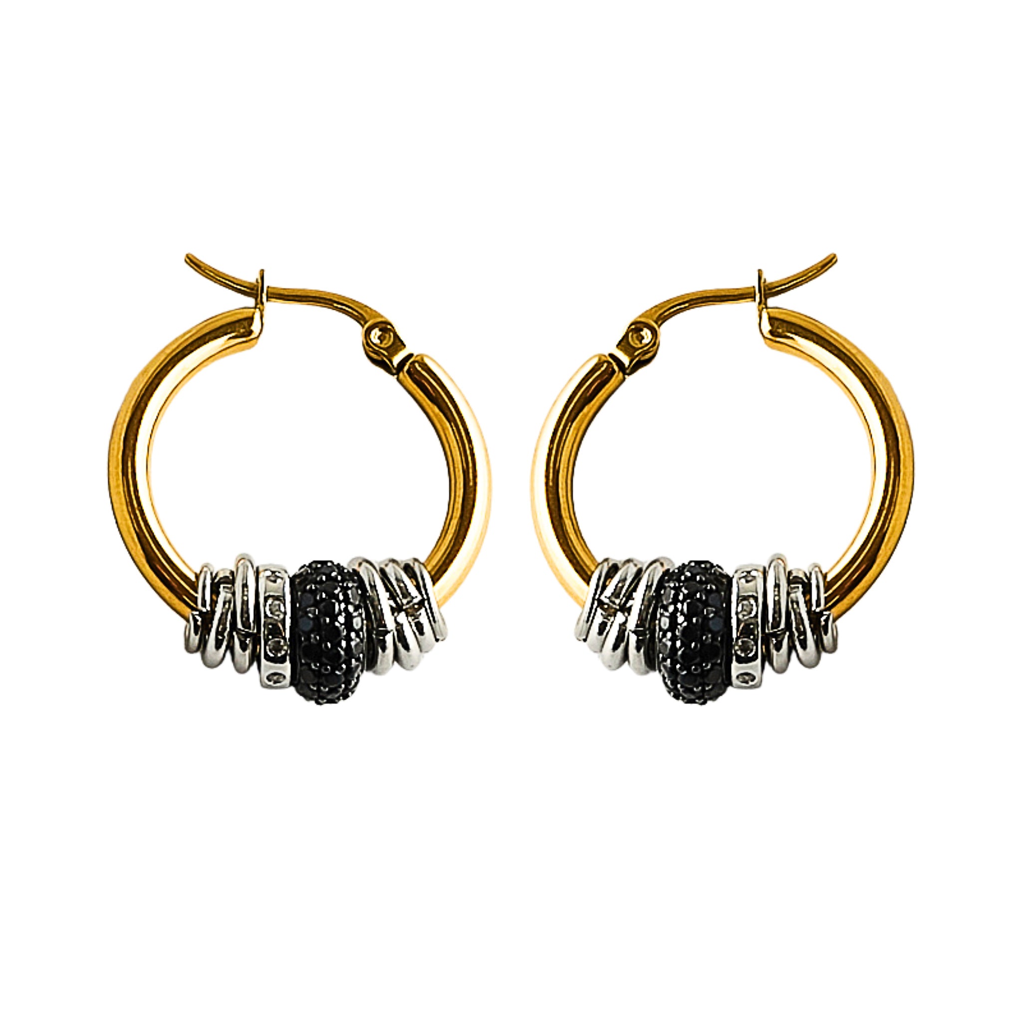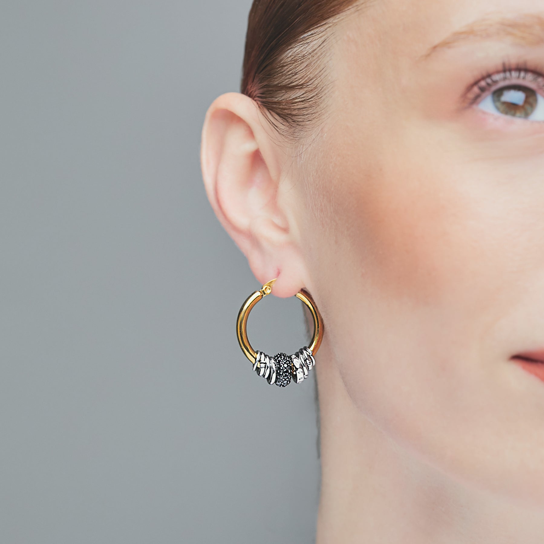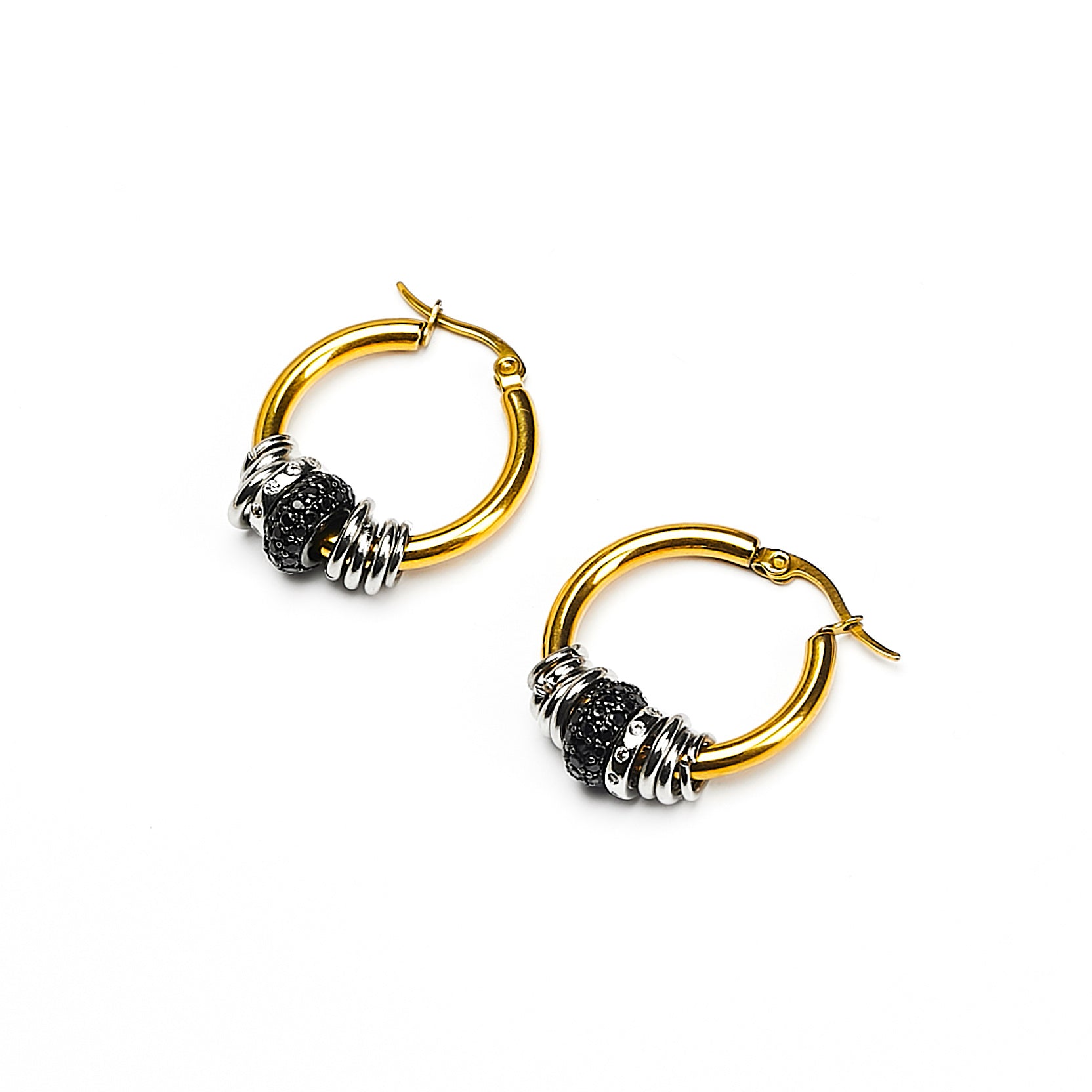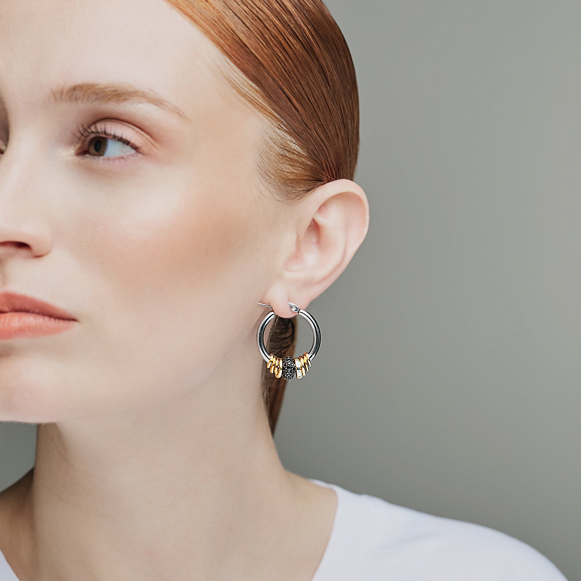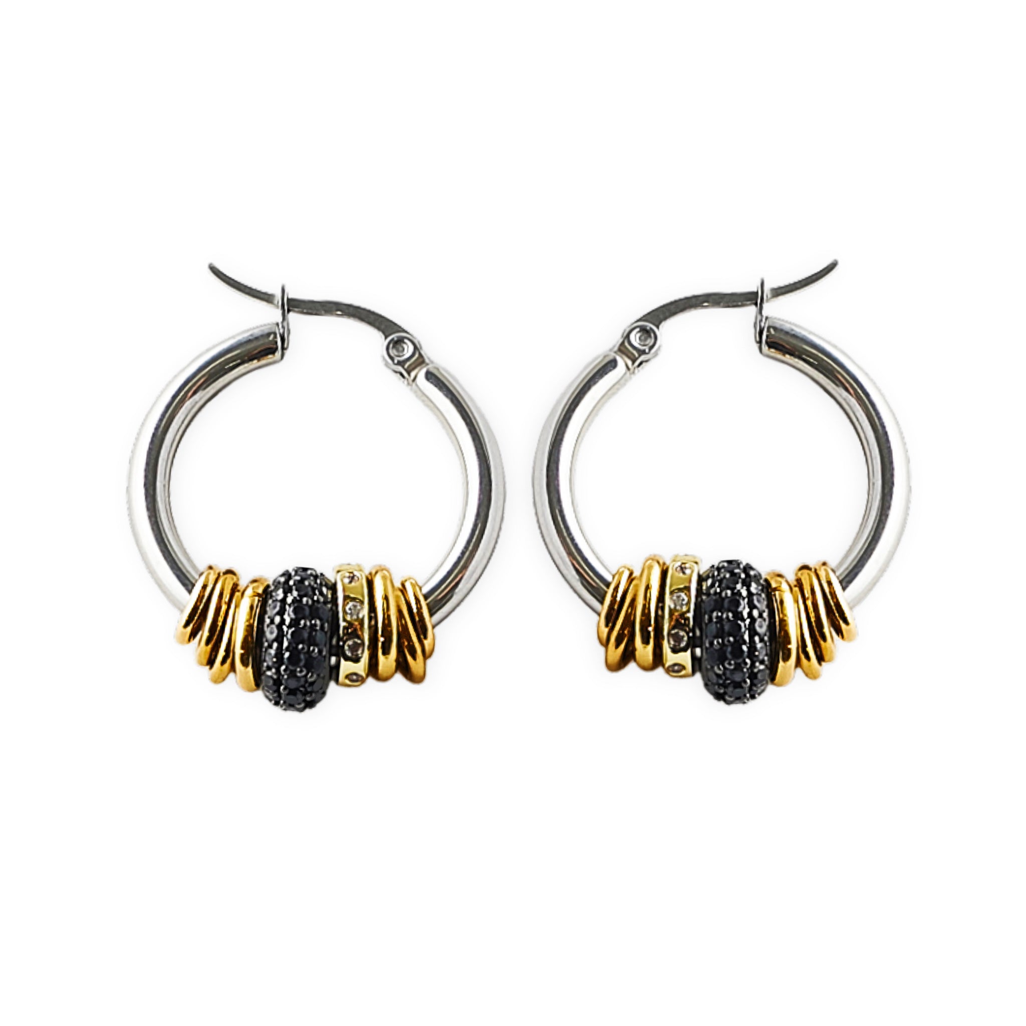 Disponibles en dos acabados —acero inoxidable natural o bañados en oro de 18k—, combinan anillas metálicas y entrepiezas de latón con circonitas que capturan la luz con un brillo sofisticado.