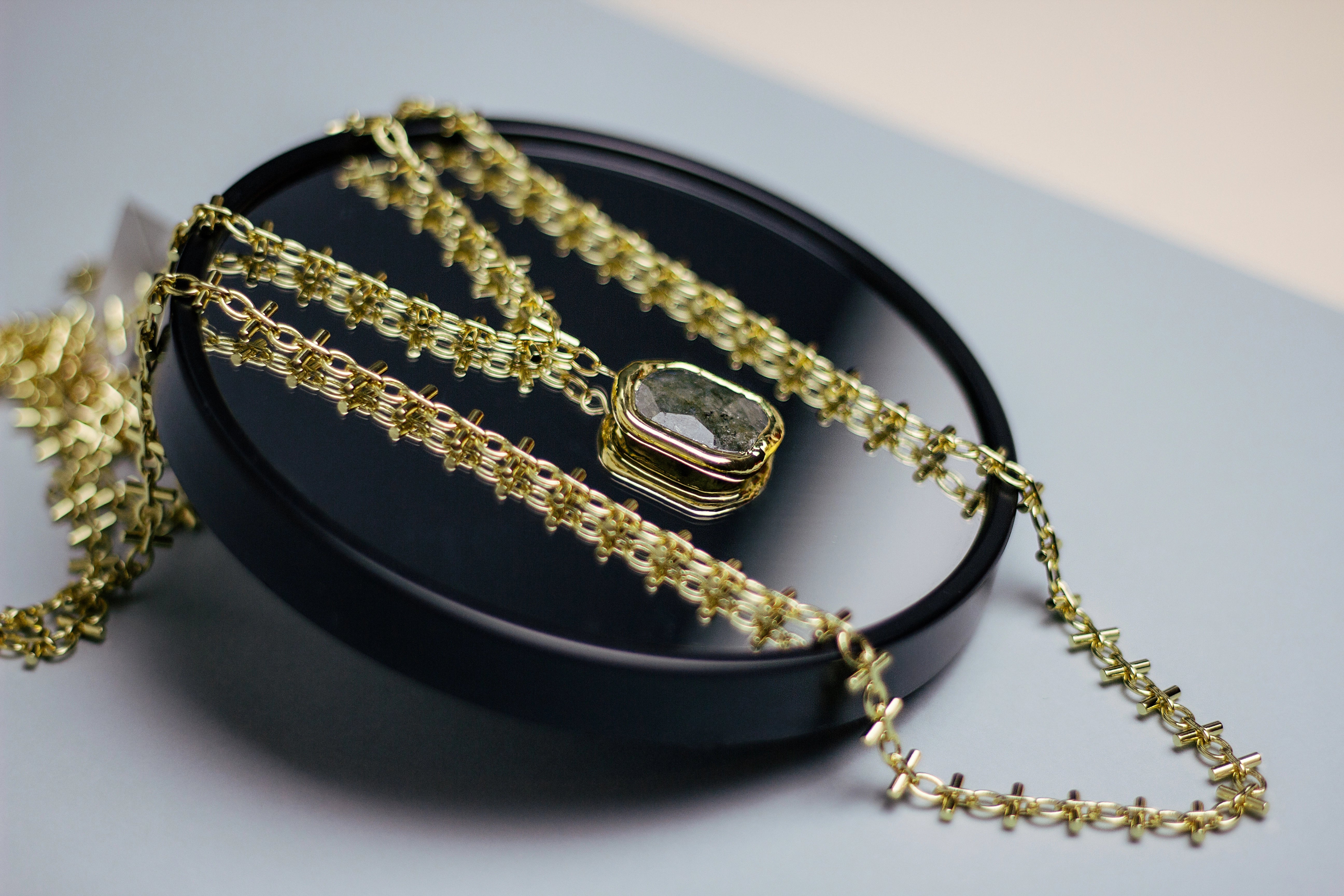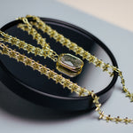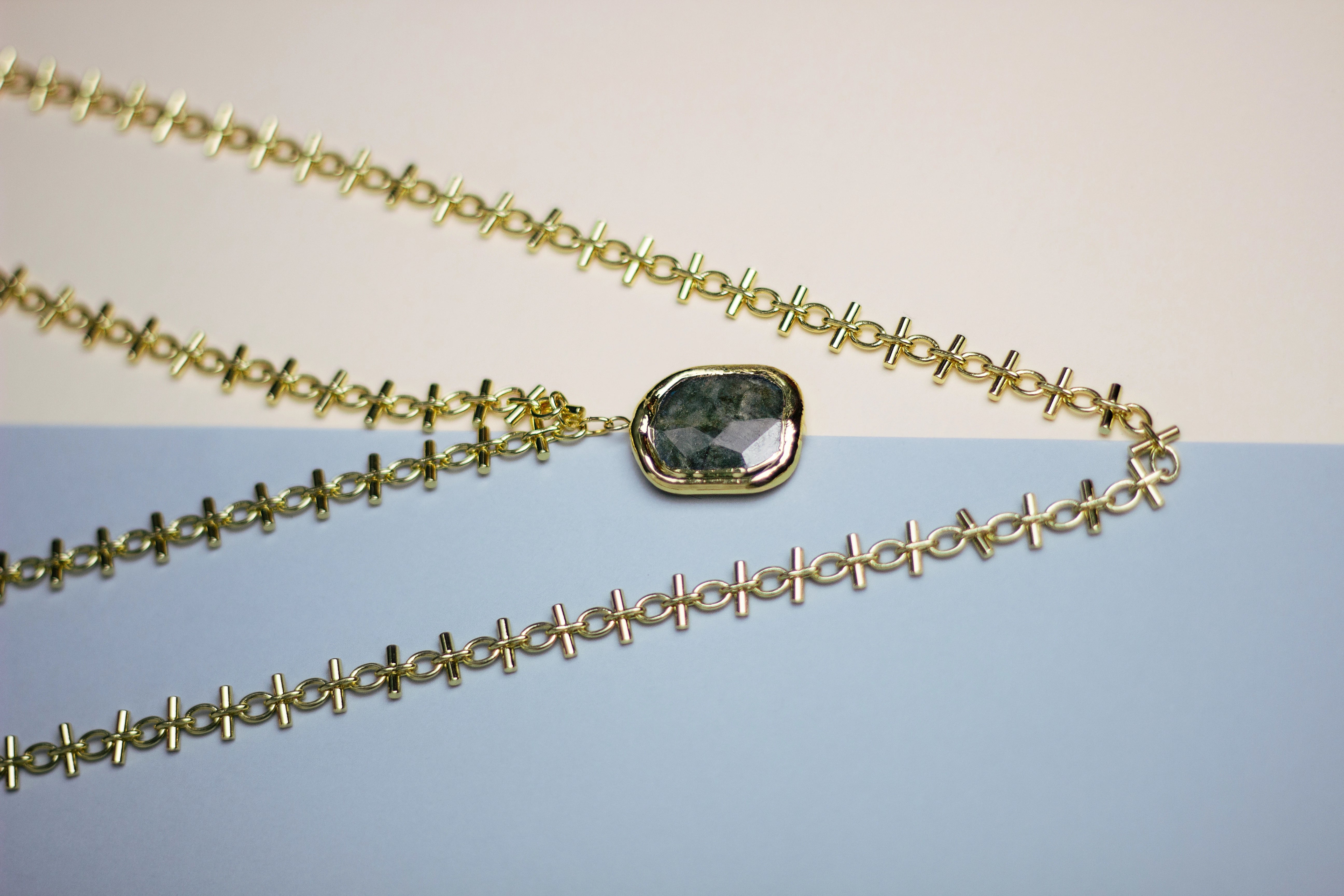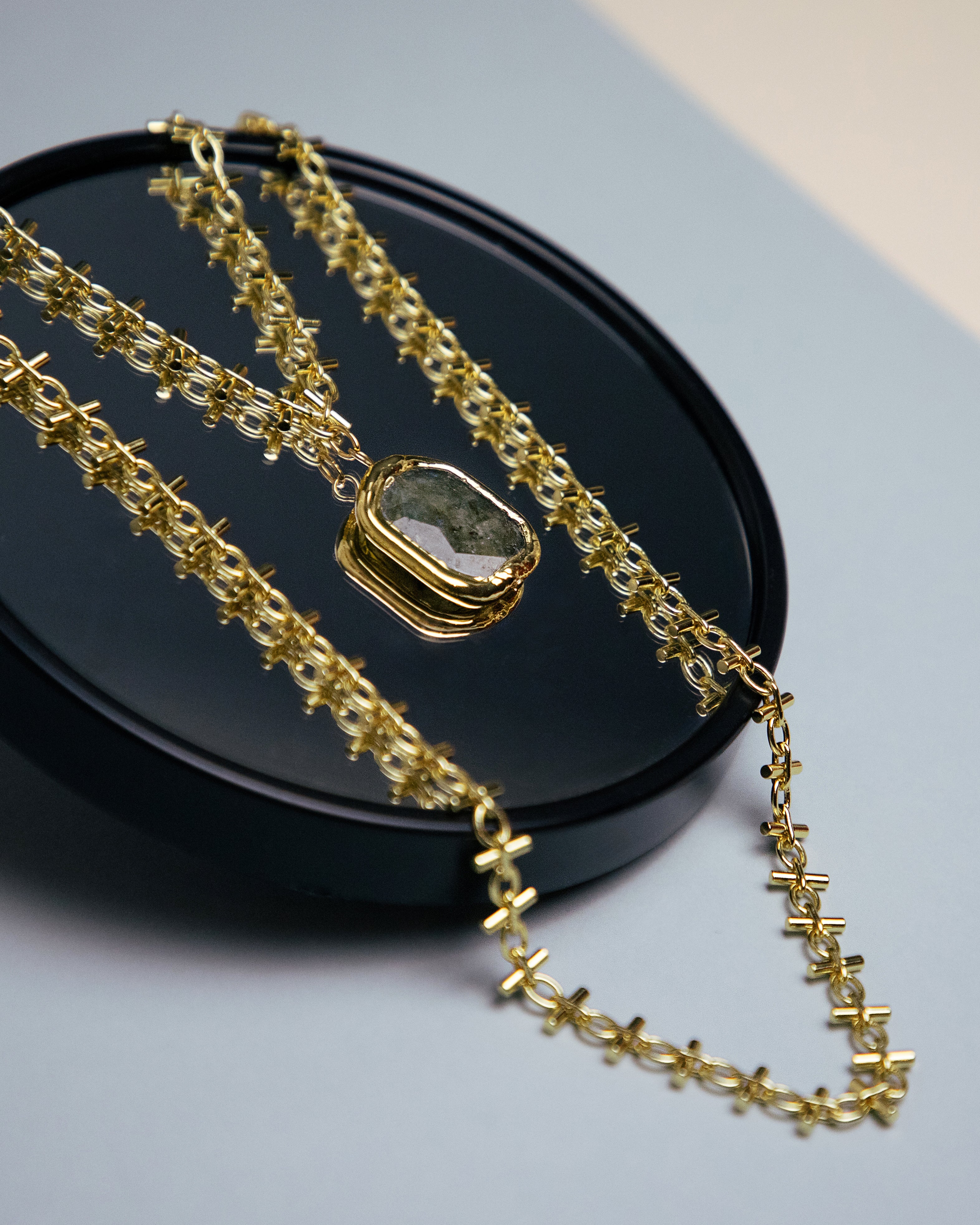 Collar largo de doble vuelta con cadena de eslabones de latón bañados en oro de 18k. El colgante central, una labradorita natural engastada en un borde dorado facetado, destaca por su textura y magnetismo visual. Con longitudes de 70 cm y 58 cm, esta pieza aporta versatilidad y presencia a cualquier estilismo.