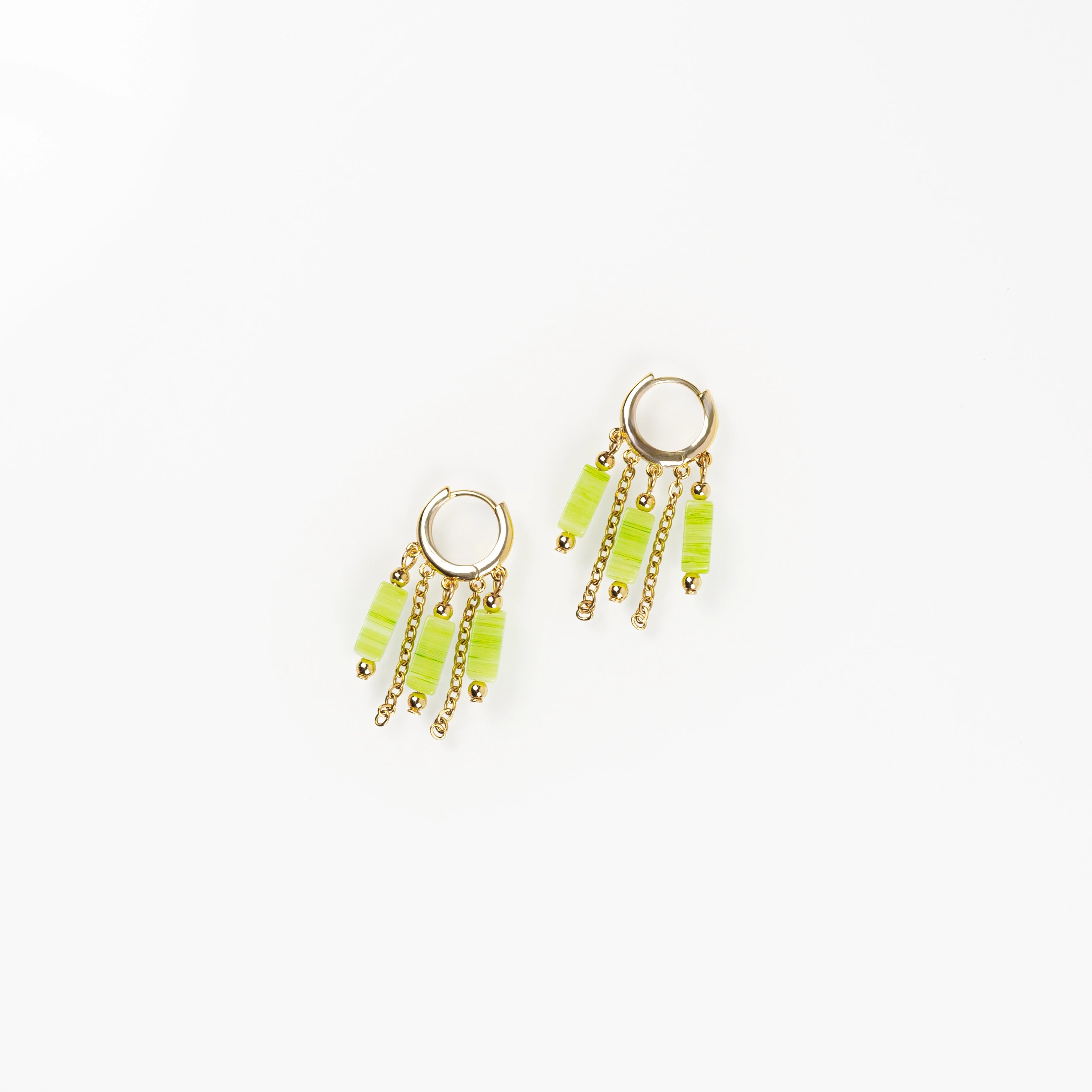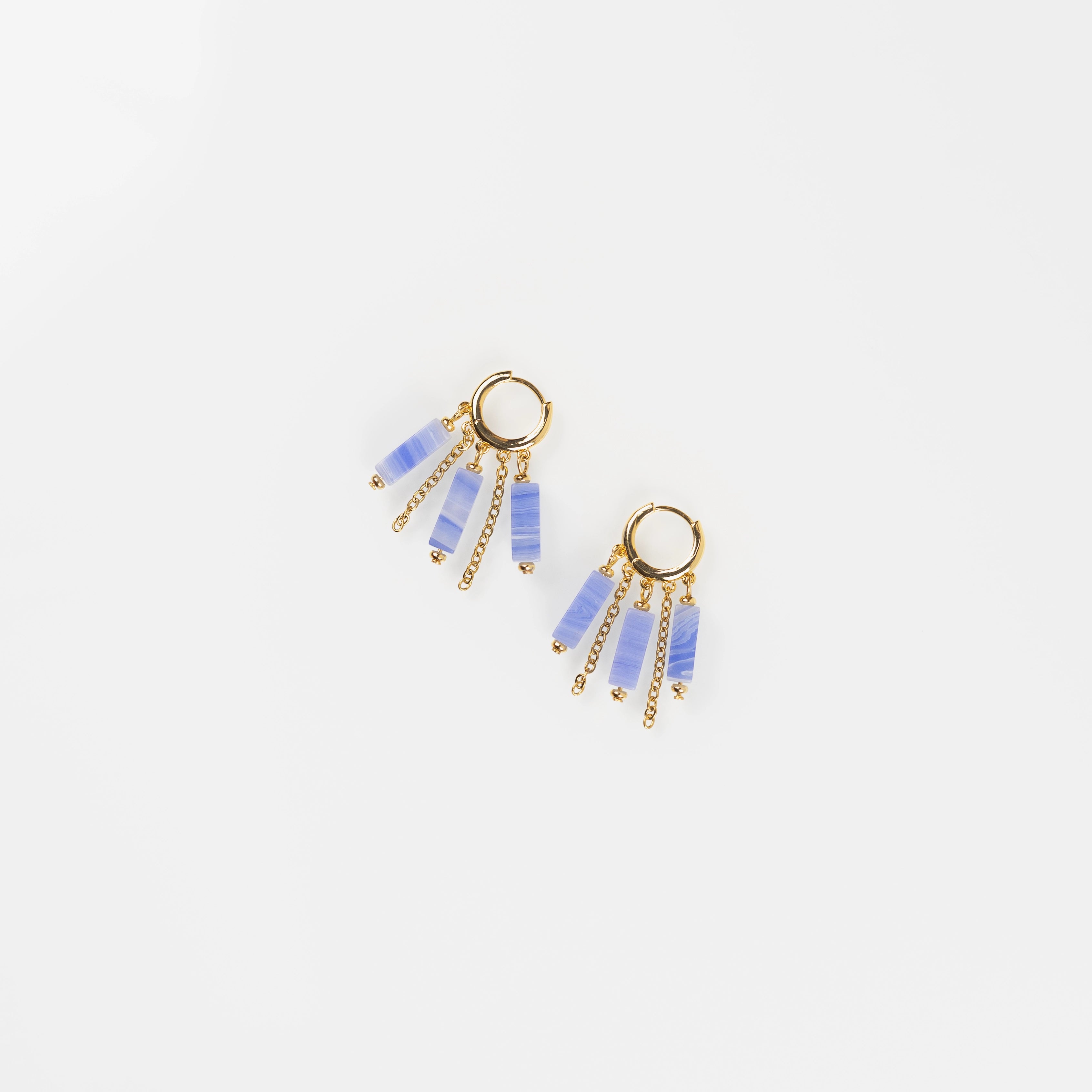 Los pendientes Soleá combinan latón chapado en oro de 18k, cadenas de acero inoxidable 304 y piedras preciosas pulidas de corte rectangular. Una pieza ligera, con movimiento y carácter.