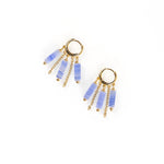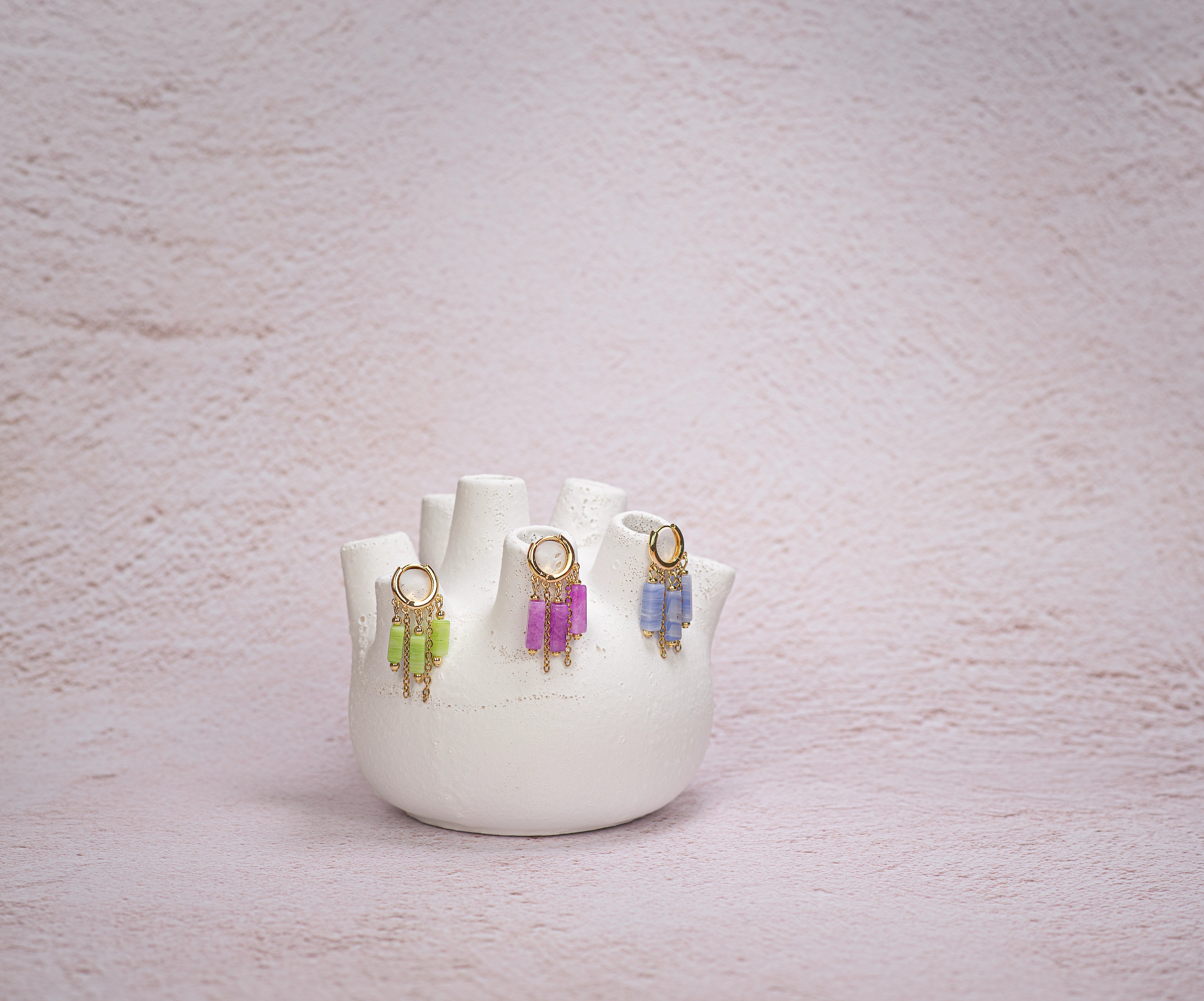 Aros dorados de perfil limpio y proporción justa. De ellos cuelga una combinación de piedras naturales talladas y cadenas doradas que dibujan una silueta vertical con ritmo y presencia.