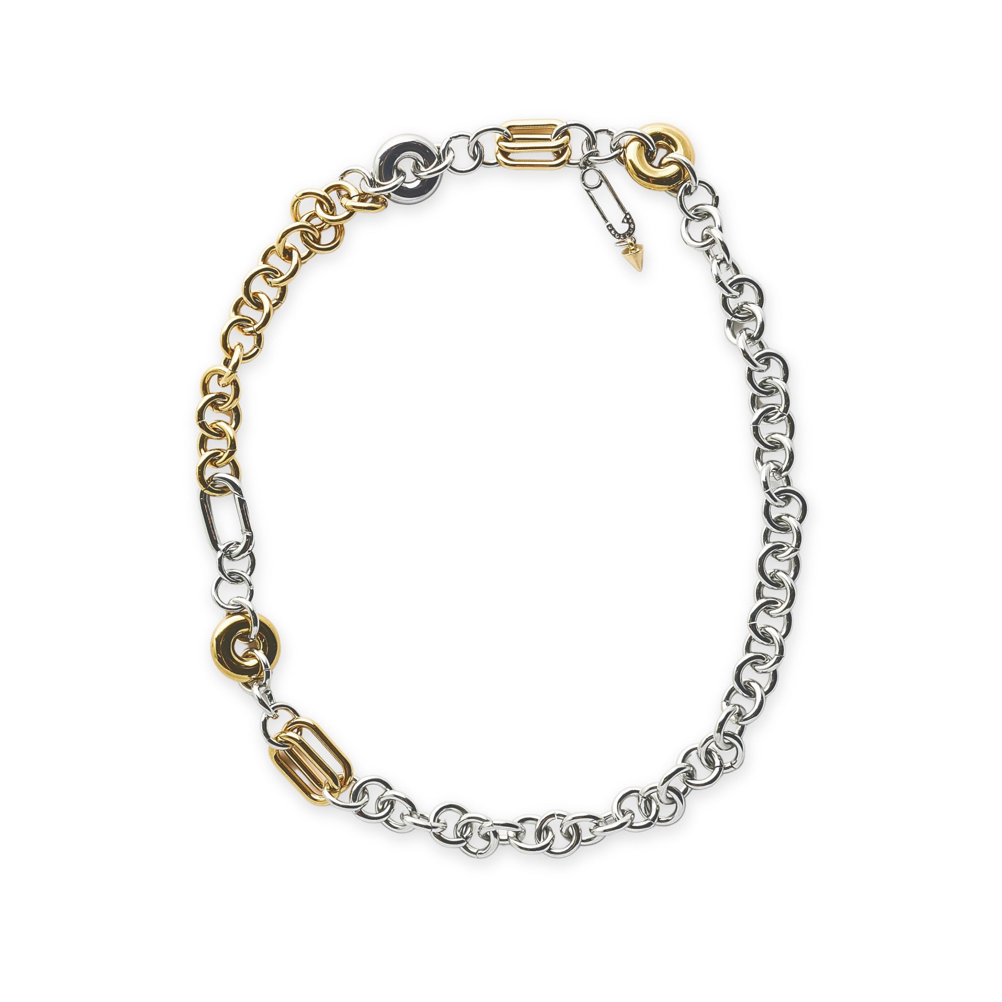 Su diseño combina cadenas de acero inoxidable en distintos grosores y tonalidades —plateado y baño dorado 18k— creando un equilibrio entre lo rebelde y lo refinado.