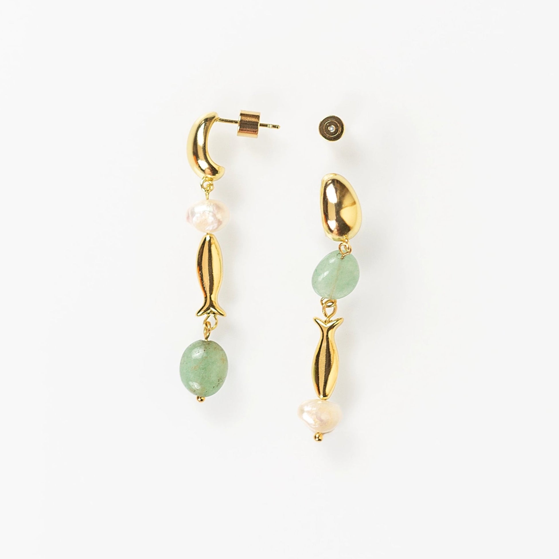 Inspirados en las costas gaditanas, los pendientes Zahara combinan la frescura de la aventurina con el brillo natural de la perla. Una pieza en movimiento, con un charm de pez dorado como símbolo de libertad.